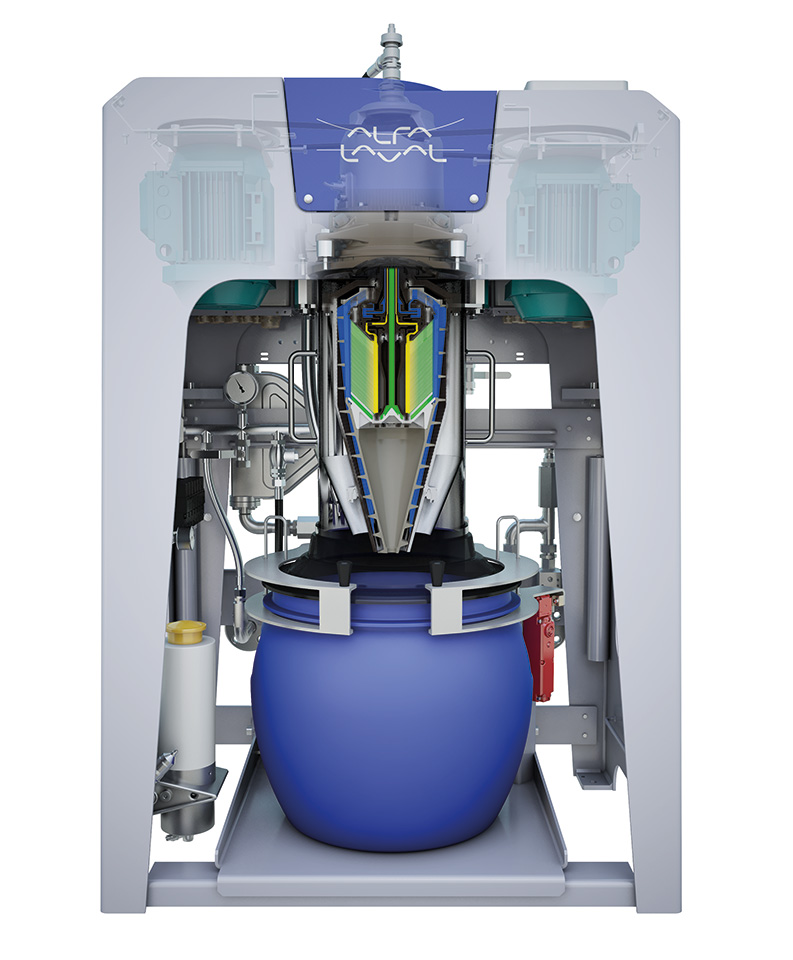 The separator bowl containing a disc stack rotates at high speed and solids from the waste oil feed accumulate at the periphery. From the periphery, the solids are continuously discharged by a patented spiral-shaped device called the XCavator into a container under the separator. The amount of solids accumulated in the container is continuously monitored by means of a load cell.